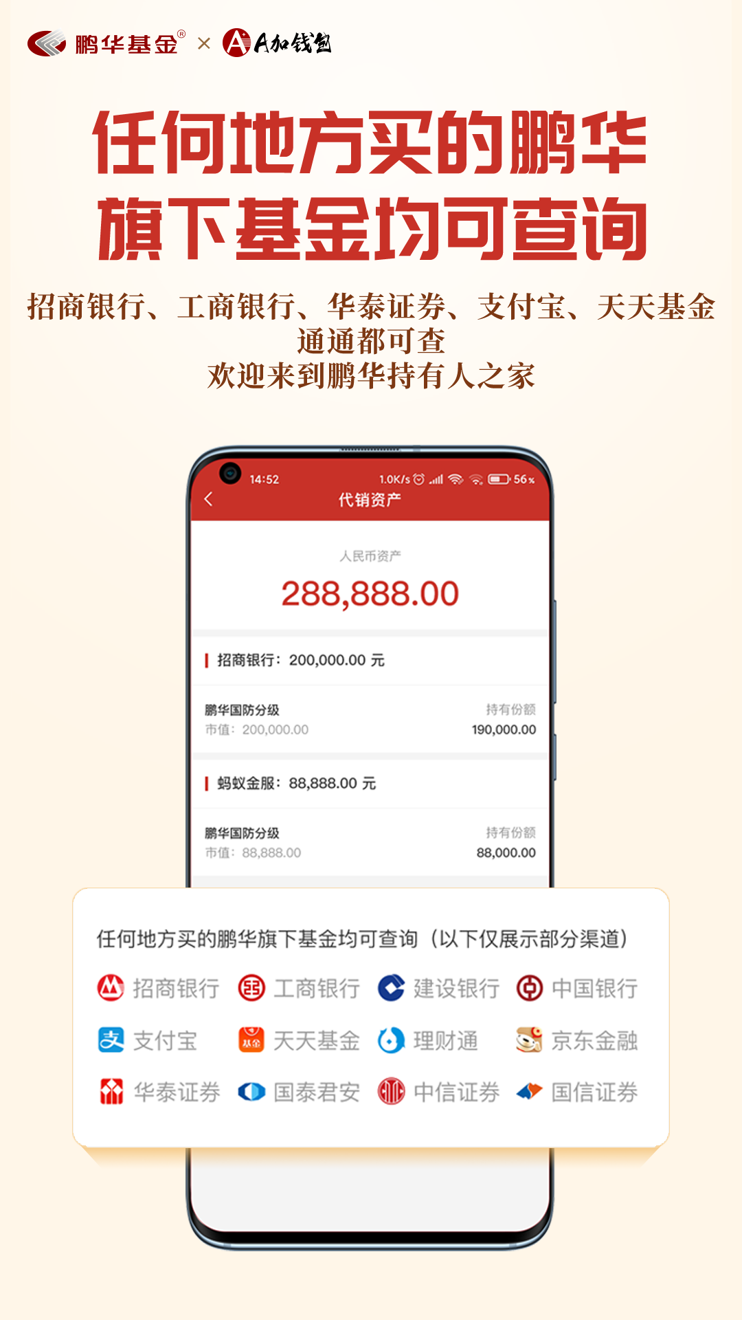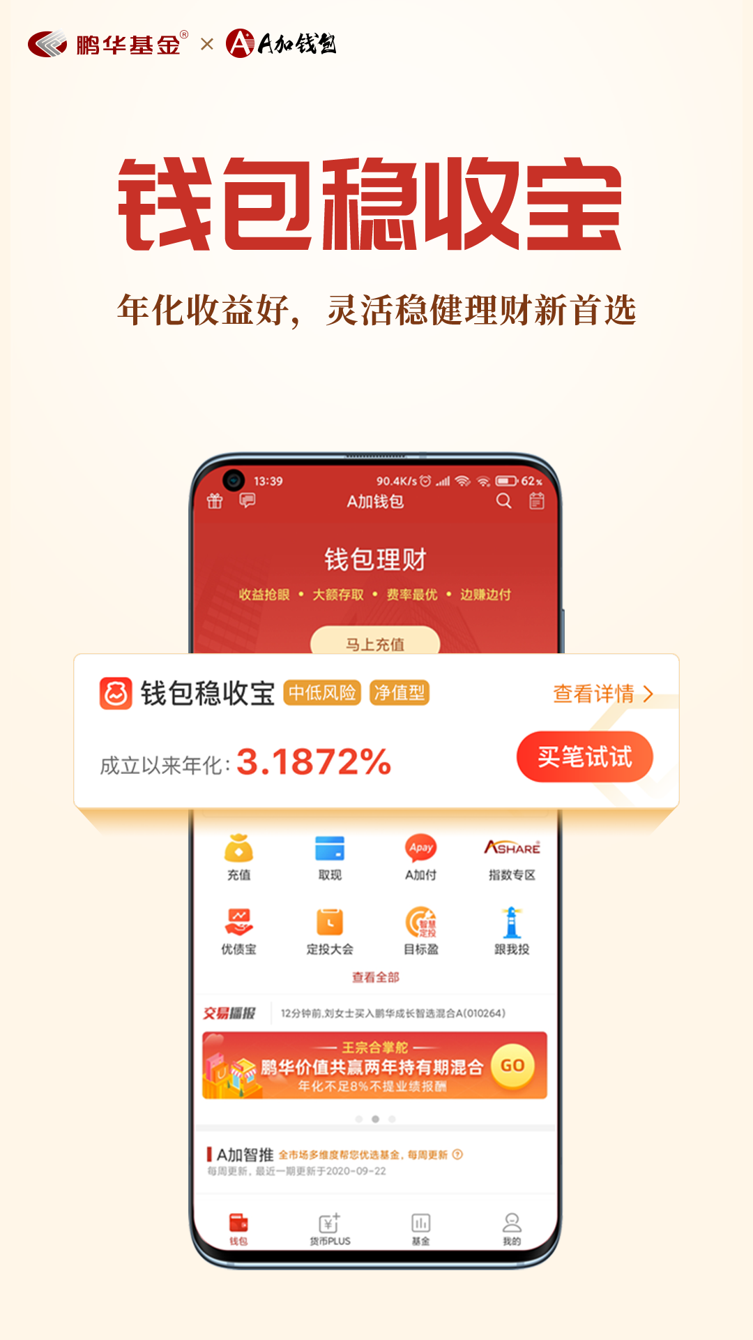 鹏华A加钱包是鹏华基金官方APP。投资者可通过A加钱包对鹏华旗下公募基金产品进行交易和购买资产查询。资金在银行托管,安全有保障。