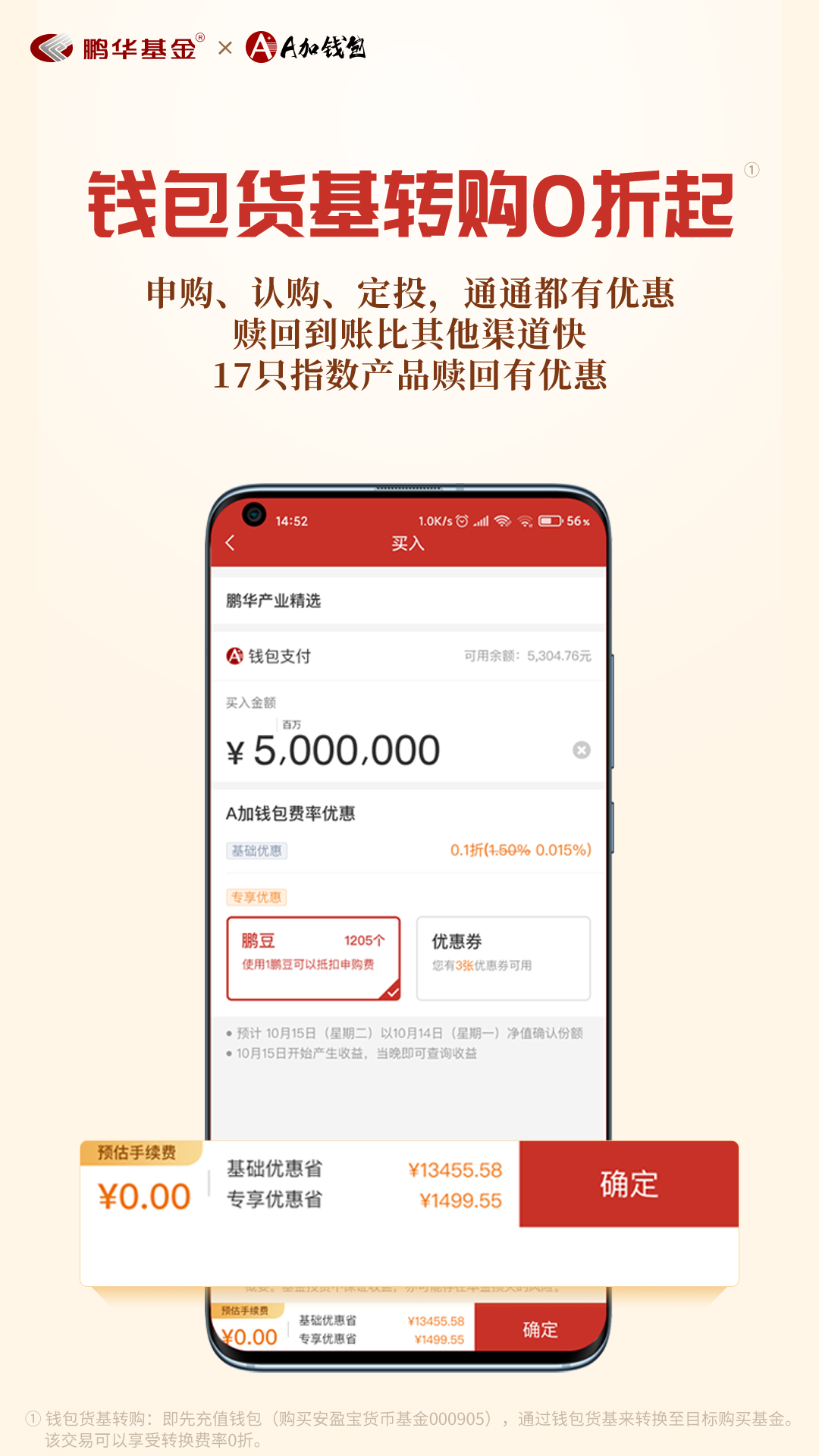 1、 购基真省钱:使用钱包货基转购+鹏豆,购买鹏华全场基金手续费低至0折!
