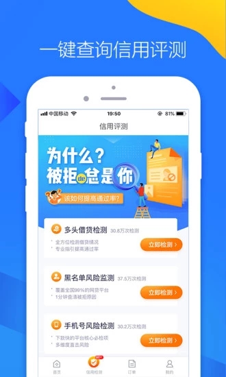 随时随地查询个人信用,黑名单查询、多头借贷、手机通讯录风险监测,让你快速了解、优化信用,从此贷款不再被拒。