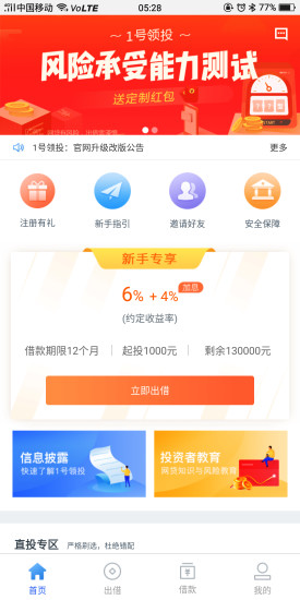 1号领投app是为了方便老百姓日常的借款需求而建立的。公司坚持诚信为本,客户至上的经营宗旨,带领全体员工同心协力,开拓进取,为了不断适应市场的激烈竞争,P2P在线交易平台。