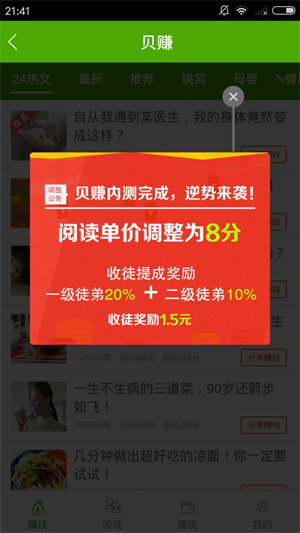小贝热闻拥有转发与收徒两种收益方式,每天花少量时间即可获得稳定收益。