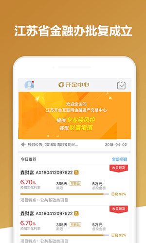 开金中心app是一款金融理财软件,开金中心app面向各类金融机构、金融服务机构,以及有融资需求的企业和个人,开金中心app提供与金融资产交易相关的产品研发、设计、咨询、挂牌交易、登记结算、受托资产管理等服务。