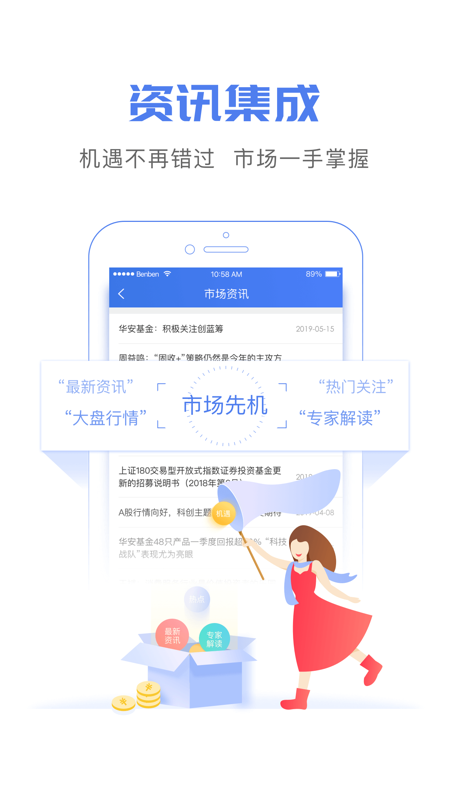 华安基金是由中国证监会监管的正规公募基金公司。作为国内首批成立的公募基金之一,深受6000万用户信赖。本应用是由华安基金打造的一款安全、专业、便捷的掌上投资平台,集成在线交易、现金管理、投资工具箱及智能理财等服务功能,一站式满足您的理财需求,是您身边的全天候投资专家。