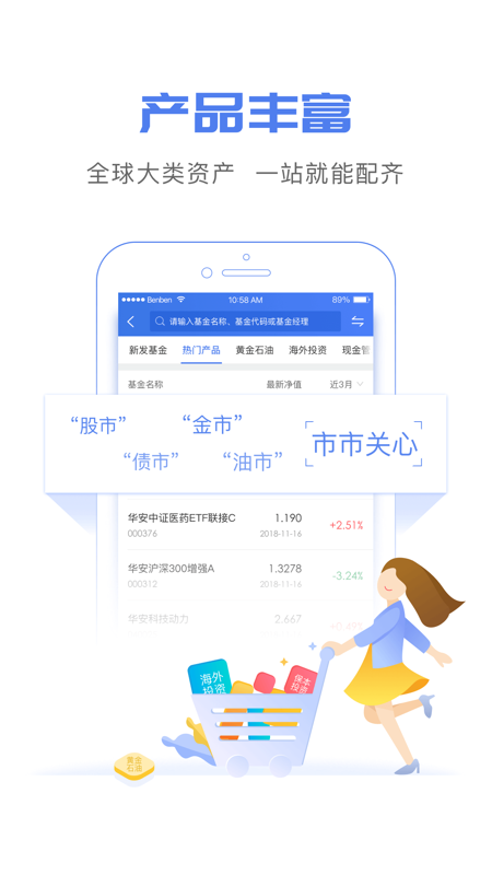 品种齐备 - 股债金油,样样都有;国内海外,想买就买。